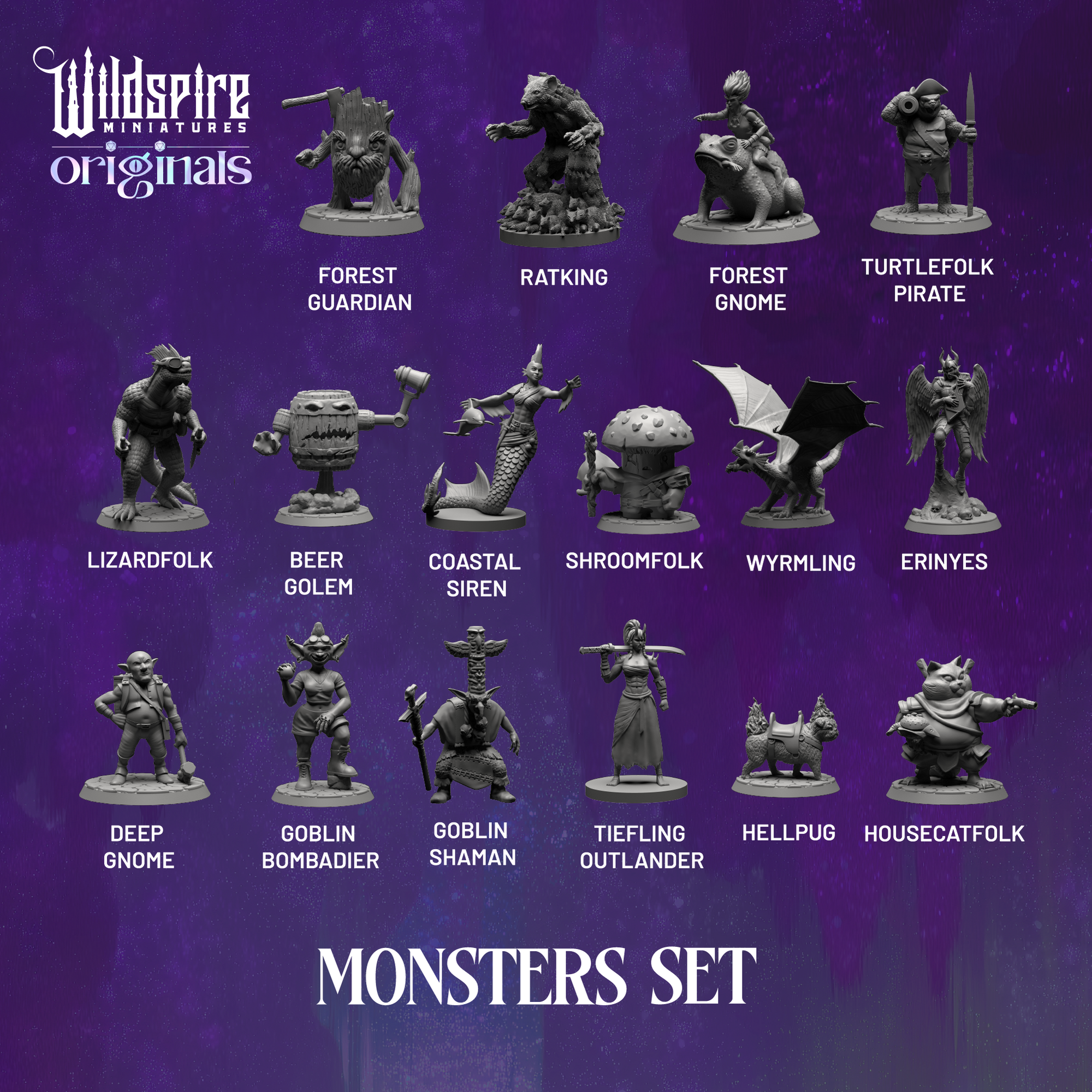 Deep cast of fantasy creatures compatible with DND and fantasy tabletop games. 16 unique creature models (no duplicates). Free digital download of character sheets for each miniature (see our Downloads page).